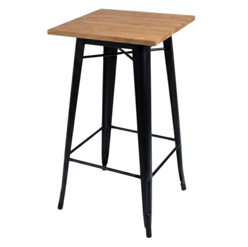 Deze metalen statafel met houten blad geeft een industriële look aan uw feestlocatie. Combineer ze met onze Wagon barkrukken.